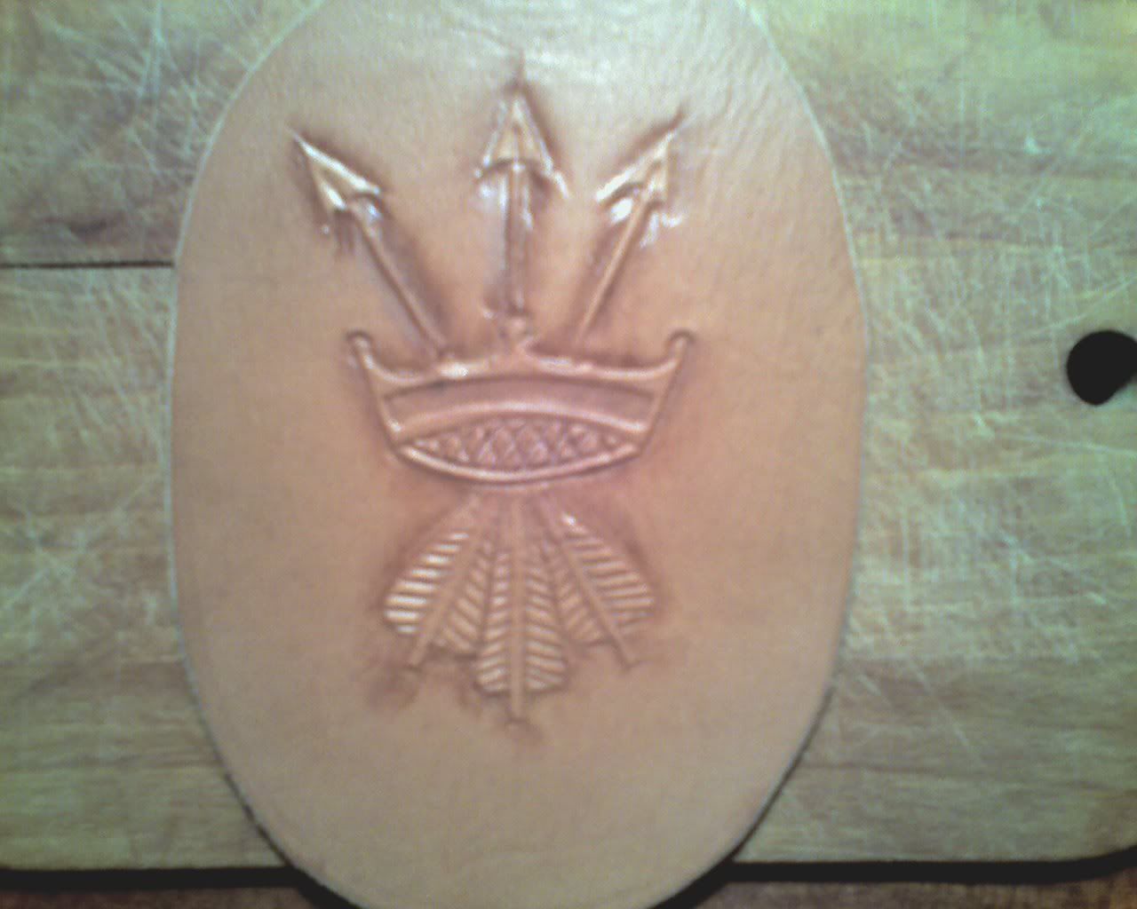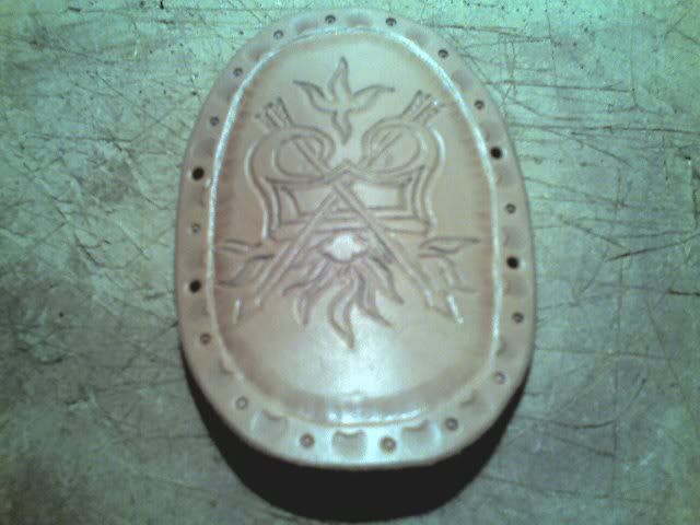The brace is for a archer in the Burgundian army of Charles the Bold in the 1470's. I'm actually making a kit for a archer (duh) from the dutchy of Brabant (actually from Breda) who joined the 5th compangie d'Ordannance. This sunday we have a weaponstraining in Eindhoven, so I'll try to make a picture. The drawing in the leather is actually a symbol worn by the mounted archer bodyguard of Charles the Bold during the 1470's. The edges are stamped, but the symbol itself, the firestrike, is freehand. I'm actually planning to make some more for sale. But with other prints. Both religious as vulgair . There will be one strap on each side and a bronze buckle. -------------------- I reject your reality and substitute my own