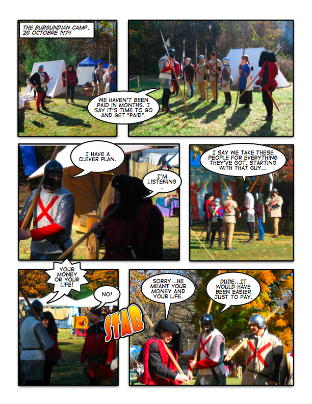 HI All,We attended the NH renn Fair this weekend past, as a part of our negotiations for future events on the property the Fair is held on. While it was a typical fantasy Ren Fair, it did give us a civilian population to interact with, so we took o the role of a 'garrison' imposed on them. We also got to teach some good lessons straight froim judicial records in Burgundian territory, why armies were usually found as unpleasant companions for a civilian population. The comic that follows is inspired by some of our activities at the fair - pardon any farbiness, one of the persons in a line up is a young girl 'pirate', volunteer, from another group, that 'stole' some valuables from a vendor, for a scripted mob confrontation, so her only borrowed kit is an over large livery, a glaive, and a helmet.... Edited to add, that the hapless 'victim' in the comic, is John Ramsden, of Nevilles. [ 11-01-2008: Message edited by: chef de chambre ] -------------------- Bob R.