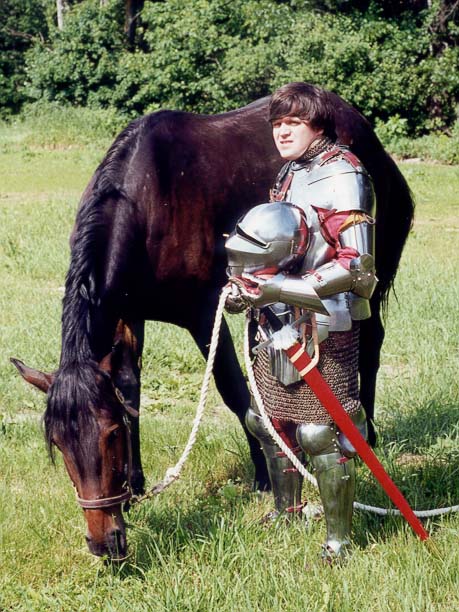 Hauptmann, What I wouldn't GIVE to be closer to you, or Wolfe Argent, or ANY WoR group. It's going to be mighty lonely down here. As a matter of fact, I'm just going on the assumption that once I get my kit together I'm basically just going to be a "wannabe straggler" with whatever group will have me for whatever event, especially for the first couple of years (nudge, nudge ). FyreStryker: I agree. I figure they get it the exact same place they get the ol' "knight on back = immobilized turtle" gag. It's been so long, and I've learned so much since then, I honestly can't remember where I heard that stuff anymore. Heck, even in my Pyle's "Arthur and his Knights" book they're running around like mad demons, smiting and smoting everything in sight, "leaning on their swords" every couple of hours. This is almost expected from the unknowing general public, but I think where "medievalist" get it is the very common unfamiliarity with horses that 98% of the population has. The have such a hard time believing that a normal-sized horse could carry a man and his armour around effeciently and nimbly without killing it. Therefore, the horse HAD to have been about 47 1/2 hands high. *sigh*... one of these days.