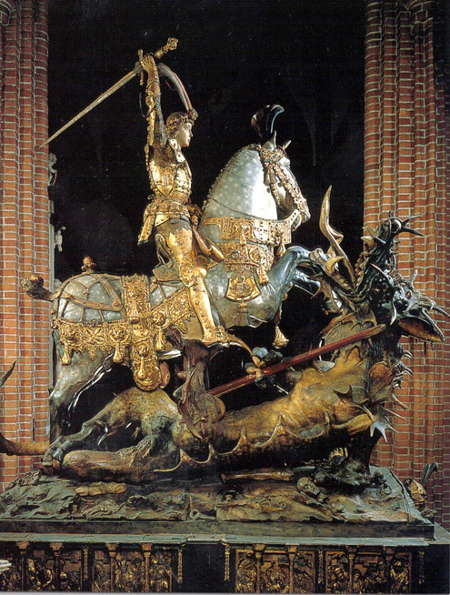 quote: Originally posted by NEIL G: Hi,I'm in Stockolm with my work, and managed to get a little time free to see the old town. The Storkyrkan ("Big church"...effectively stockholm's medieval cathedral) turns out to have a larger-than-lifesize statue of mounted and armoured St George killing the dragon, unveiled in 1489. I've never seen a reference to this piece before, although I'd hve thought it would have been a really handy reference for anybody doing a c15th knight - best I can figure is they're just so far off the high medieval track that people don't even think of doing research up here. Either way, Ill post a picture as soon as I get back home to my scanner, but a couple of useful and interesting points for the other "warhorse techies" on the list. a) St George's horse is rearing up, so you can see the underside of both front hooves. Both front shoes have large calkins. Looked like four nails per side on the shoes, but too dark to be sure. b) St George is using chain reins - seen this in several illustrations, but it's always handy to have another. c) Horses' tail is braided up into what I can only describe as a bun, complete with a bell attached to it. Unfortunately, photography wasn't allowed, but I was able to get a postcard of it, from one side only. Neil