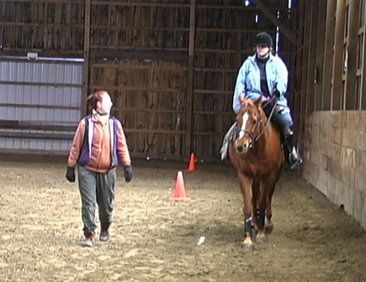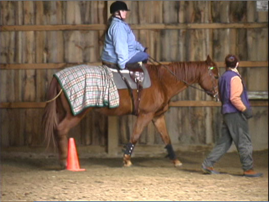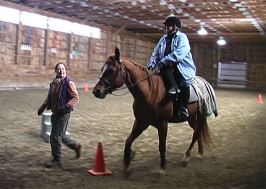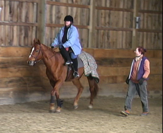Y'all will have to excuse the fuzziness of the images. I grabbed these frames from the video that Bob took.*sigh* I just noted I'm posting under Bob's handle again.  Any hoo, as promised. Gail DiScipio (ground), is explaining aides as I am rounding the corner. My mount for the lesson is a grumpy little QH named Ben. Gail offers me a crop to help keep Ben from taking advantage and turning out on the corners. I'm not left handed so was having a problem riding single handed with the left, even with the neck reining Phantom and I have been working on. It kind of gave me the use of my "right leg" without it actually being there. At the trot for the first time in a side saddle.  More trot. Just can't say how much I really enjoyed this experience. Ladies on the forum...I highly recommend it. (edited to correct a spelling error) Jenn [ 01-23-2007: Message edited by: chef de chambre ]