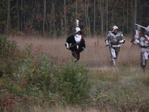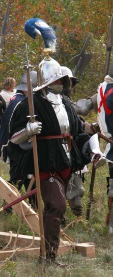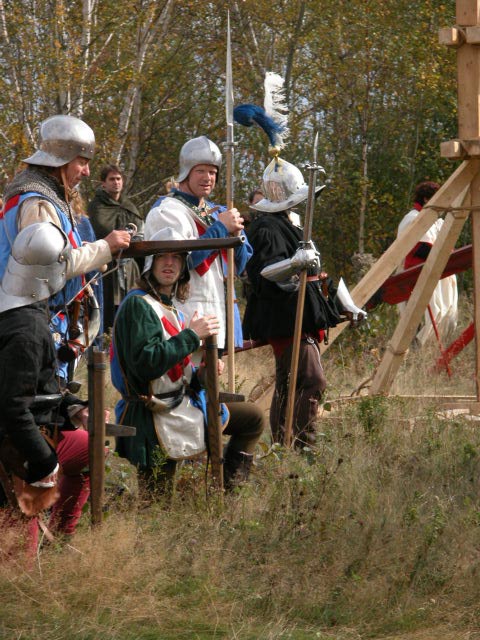 Here are some bonus shots I didn't put up on the Archive. A disinier inspecting a recruit, and about to find his equipment wanting, as I recollect - (no pay for him?) A Burgundian ambush, laying in wait for the careless French garrison. The ambush sprung, with me trotting along as best I might with spurs. (actually, they didn't hinder me, but I had to be careful passing through brush) A frontal shot of my kit as I was wearing it the first day. I wore a gown over my cuirasse throughout, because of the weather. It was so cold, that even wearing a cuirasse for 6 hours straight, I never broke a sweat to speak of. I really ought be mounted in that rig, but was wearing as much kit as I could to mark me as a man at arms rather than an ordinary infantryman. A shot of me chatting it up wioth one of les Compagnions. The French soldier caught who was to be executed for his contemptuous behaviour (insulting us from the walls?) Skirmishers charging forward The Duc de Bourgogne reviewing the troops. -------------------- Bob R.