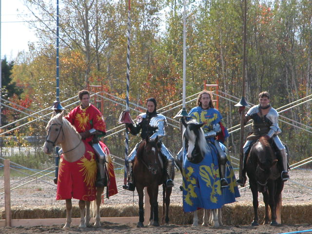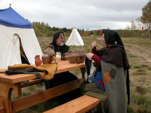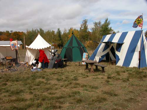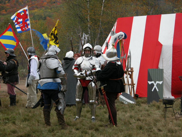 Bonjour toute le monde,Bob, Peter, Richard, and I got back to our house this morning at 2:45 am (ugh). Those visa commercials come to mind... Tank of gas to get to to Canada: $85 Dinner at Wendy's: $30 Making new friends: Priceless Day One: The departure Friday found us departing 2 hours later than we'd hoped. This plus a traffic incident (an overturned vehicle) that delayed us another 1.5 hours had us arriving at Mont St. Anne at 4 am Saturday morning. The drive was an easy one. The roads were uncomplicated. Which is good when you're in a strange place at 4 am. It's REALLY Dark! I am going to skip the Dorm experience. We met up with Martin and Ingin in the Monestary parking lot that morning. Very wonderful people and it was a real pleasure to finally meet them both face to face. Together we convoyed to the Chateau in hopes of getting some breakfast. There we found Marie and her son. After snarfing down breakfast, we headed for the event site...Plateau B. The day was originally scheduled to start at 9 am, but due to some additonal site preparations, the opening of the event was delayed until noon. This was good as it afforded us time to get the tents unloaded and raised and all the goodies unpacked. We met Hugo and several others from Compagnons d'armes. From the moment we arrived, they made us feel like family and we were all very delighted to finally meet each other. There were some language barriers at times, but everyone was patient and worked to overcome them. I'm starting to pick up some French and hope that by next year, I will be able to hold some basic conversations. We were once again pleased to see Bernard, Carmen, and Kenneth. Once the tents were set up, people set about the activities as they came about. The schedule seemed chaotic at best, but we all did our best to roll with it. There were about 1500 visitors to the site the first day. Pilgrims dressed in basic white, brown, blue, green, etc... covers. They would stop by and ask what people were doing, and about the equipment. In the camp, people drilled, stood on guard duty, and assaulted the "castle". The Burgundians we fighting against a French garrison. On the other side of the trees, you would hear the music from the lists. Duke Philippe and his nobles were running at rings, quintain, and breaking lances. The did not make a bad impression. The horses had trappers with coats of arms and Philippe wore a suit of "gilt" armour. While not the real thing, it was a good impression. He wore his coat of arms as did his horse. They would occasionally ride through camp and the entire group would go by the path and pay their respects. The Compagnons d'armes ran a very nice camp. Everyone was in character and they ran it like a good military one. Ranks and names were known and "Mon Capitaine" could be heard frequently. They ran a muster where soldiers were called, their profession listed payment for their services. There was food, song, and combat, and weapons practice. Martin set up his writing slope and pigments, and Ingin worked on her embroidery. Occasionally "pilgrims" would come into the tents to see what was going on. Marie worked diligently on her son's clothing to make sure that he was protected from the elements and was able to participate with the host. He had the cutest 15th haircut. Everyone was so nice. We felt like we'd been adopted. The weather was cold, but for the first time it wasn't something I focused on. Good company does that for you. At the end of the day, we went and had supper in a HUGE striped tent and then sat through a tent meeting where grievences were expressed by everyone seeking a way to improve the problem. By this time everyone in our group was "dead" on our feet. We were cold and tired and we all retired to the dorms. We moved into the gymnasium and set up our own little enclosure with Martin and Ingin. To be continued in "Day Two"...I'm still tired. -------------------- ad finem fidelis