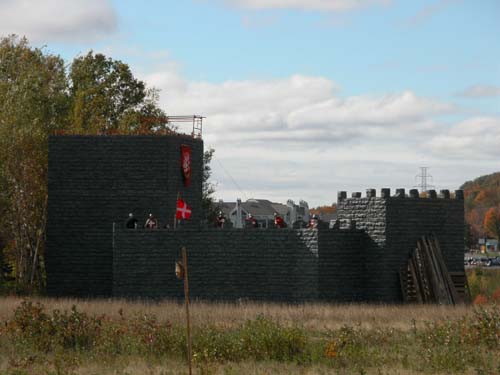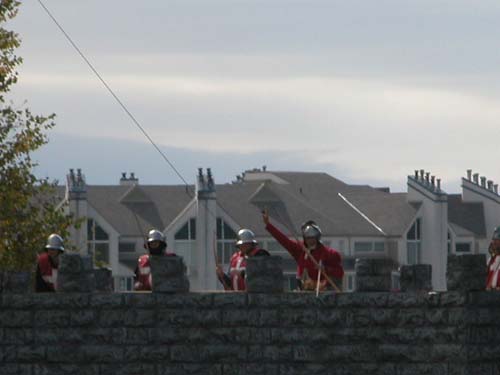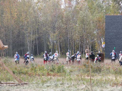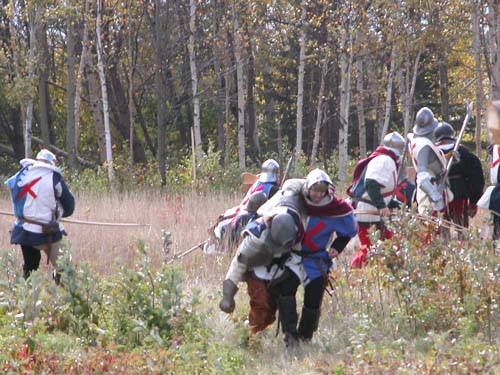 As promised, here are more photos - The Duc de Bourgogne arriving with his entourage. "Chateau de Beaupre" (under construction still - the thing comes apart, and will be at the next festival even if it is closer to Montreal, to my understanding. it gives you some idea of the scale of the castle The defiant French garrison Another shot of a melee. mon amie Pascal, a Franche Comte Burgundian is showing his love for Louis XI men, while I am putting down a glaiveman near to him. My assasin (the French Captain) can be seen running up to dispatch me from the right background of the photo - I believe he 'killed' Pascal in that action as well. The captain is none other than Bernard Rieutord.  A Burgundian assult Supporting fire Me after being killed by the garrison commander. More in the next post.