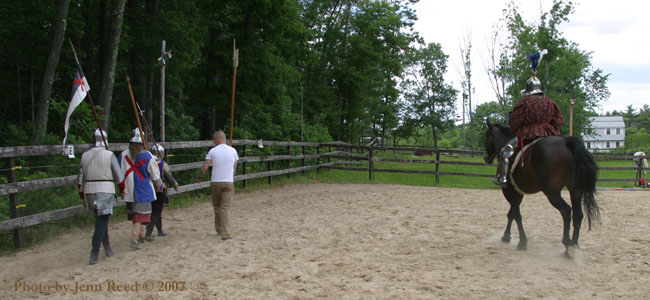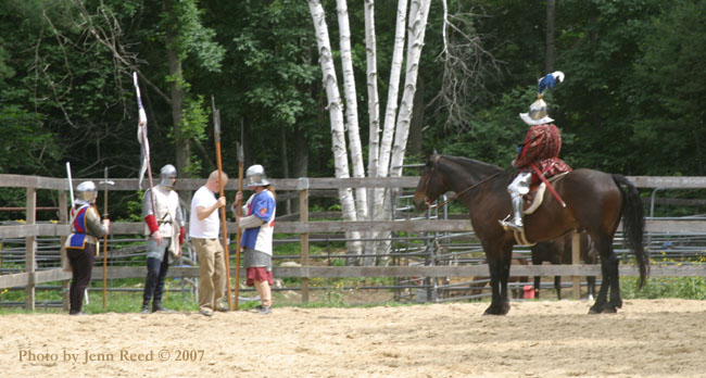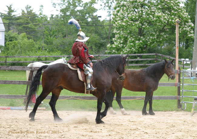We had a drill that involved one of our horses with a rider and the other being handled from the ground.It was a session to get the horses acclimated to armour and weapons again. Bob is riding in near complete harness for the first time since his riding accident back in November 2006. Since it was a relaxed drill, we weren't as strict on our clothing regs as we usually are, so please ignore the dockers.   [ 06-25-2007: Message edited by: Fire Stryker ] -------------------- ad finem fidelis