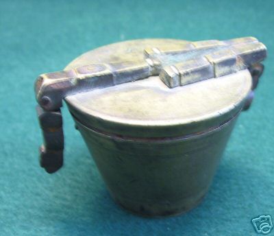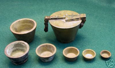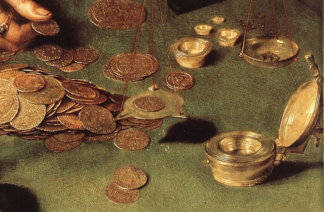 I found the nested weights on eBay. There's someone in Europe selling a set off their antiques site for about 200 euros. Was a wee bit rich for my blood. I think they were 16th c, but had the date firmly stamped in the lid. It wouldn't hav worked, plus I think the lid latch was way more ornate.Here's a web site that talks about using a counting board. How to add and subtract with a counting board Besides the board or a cloth, I need jettons, scales, and coin weights. You'll note the little box in the image and the domino looking weights in the dish in the lender picture. Those are coin weights. Later versions a like a block with the image of the coin stamped in it.