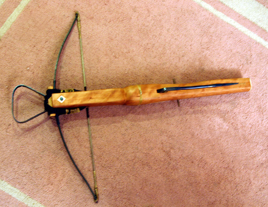 As you can see, David not only met, but exceeded our requirements. The bow does not only look as we requested, and it ought, but it is a great shooter. It has a 150 lb draw weight, as I intend to eventually use it hunting, so it can take up to medium sized game. I had been worried about the action, with a bound in nut, but the action is as smooth as silk, and the crossbow shoots flawlessly.