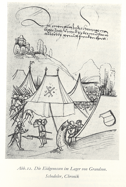 ...die im Lager Karls vor Grandson standen, Wir wissen, dass sich der Herzog nach La Riviere, Ende Januar 1476, Zelte herbeischaffen liess: 600 petites tentes et pavillons, 100 autres pavillions quarrez, deux maisons de bois, 130 tentelletes quarrees et 50 autres pavillions, 6 grandes tentes et 6 grandes pavillions quarrez et une autre maison de bois pour servir en son armee.