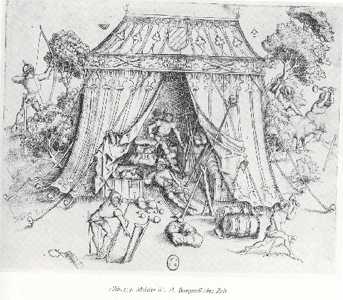 Looks like a WHOLE bunch of tents, pavillions, and a couple of portable wooden houses were taken at Grandson. So there seems to be an variety of "types". I also read somewhere that Charles had a list requesting tentage. I am currently looking for this source. We also have a book that should be arriving soon "The army of Burgundy 1465-1468" If there are any references to such things we will be sure to post them. It is in French so it may take us a little while to translate it.  Other evidence is contemporary drawings. The tents that follow are clearly Burgundian by their livery markings and heraldry. These tents show some designs that appeared on them. I do not know if they were painted or embroidered and will not venture a guess as we are looking for evidence and not opinion.