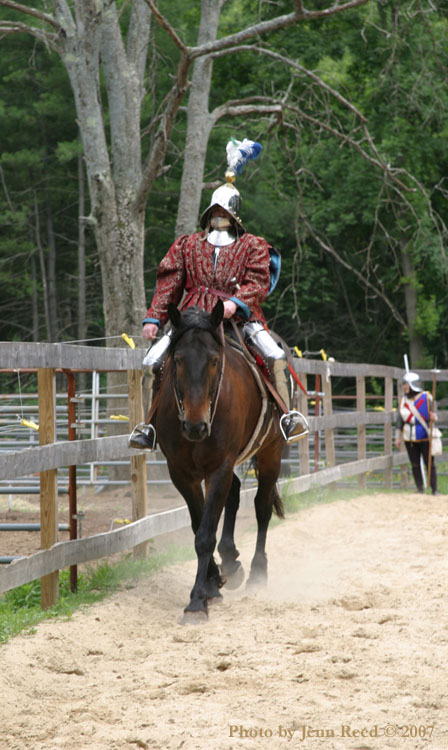 We had a drill that involved one of our horses with a rider and the other being handled from the ground.It was a session to get the horses acclimated to armour and weapons again. Bob is riding in near complete harness for the first time since his riding accident back in November 2006. Since it was a relaxed drill, we weren't as strict on our clothing regs as we usually are, so please ignore the dockers.   [ 06-25-2007: Message edited by: Fire Stryker ] -------------------- ad finem fidelis
